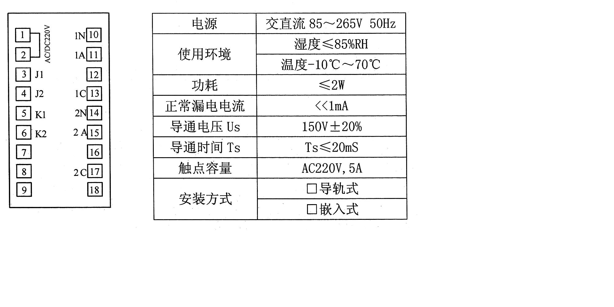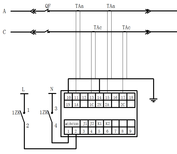 K1、K2为继电器输出接点,容量为AC:250V/5A DC:110V/2A