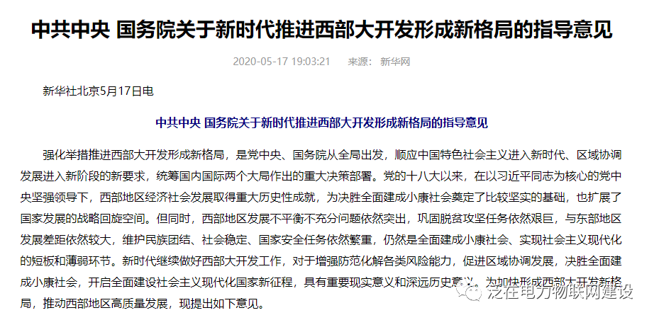 据新华社消息,《中共中央 国务院关于新时代推进西部大开发形成新格局的指导意见》(下称《意见》)于2020年5月17日发布。