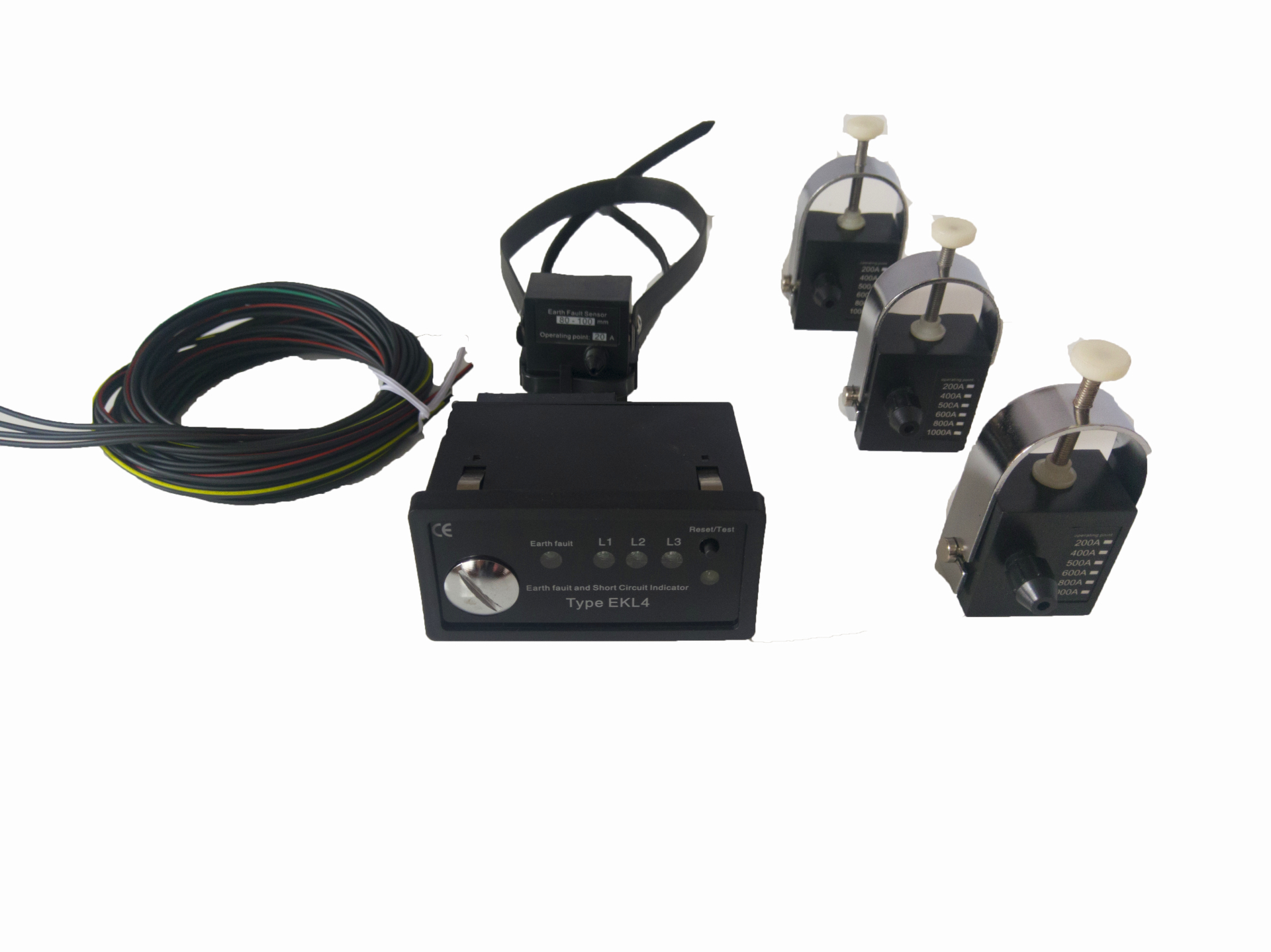 短路传感器:依据要求设定短路电流值,出厂默认电流值为800A,可按照要求定制。依据电流感应原理,当线路中电流达到设定短路电流值时,短路传感器接收到短路故障信息,并通过彩条光纤将信号传输到主机终端,终端面板上对应相的故障指示灯报警闪烁。